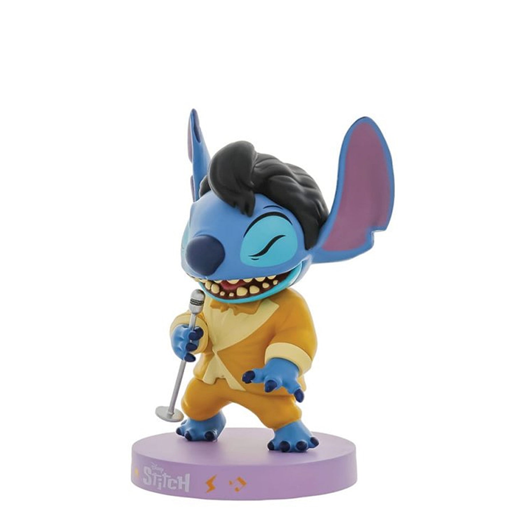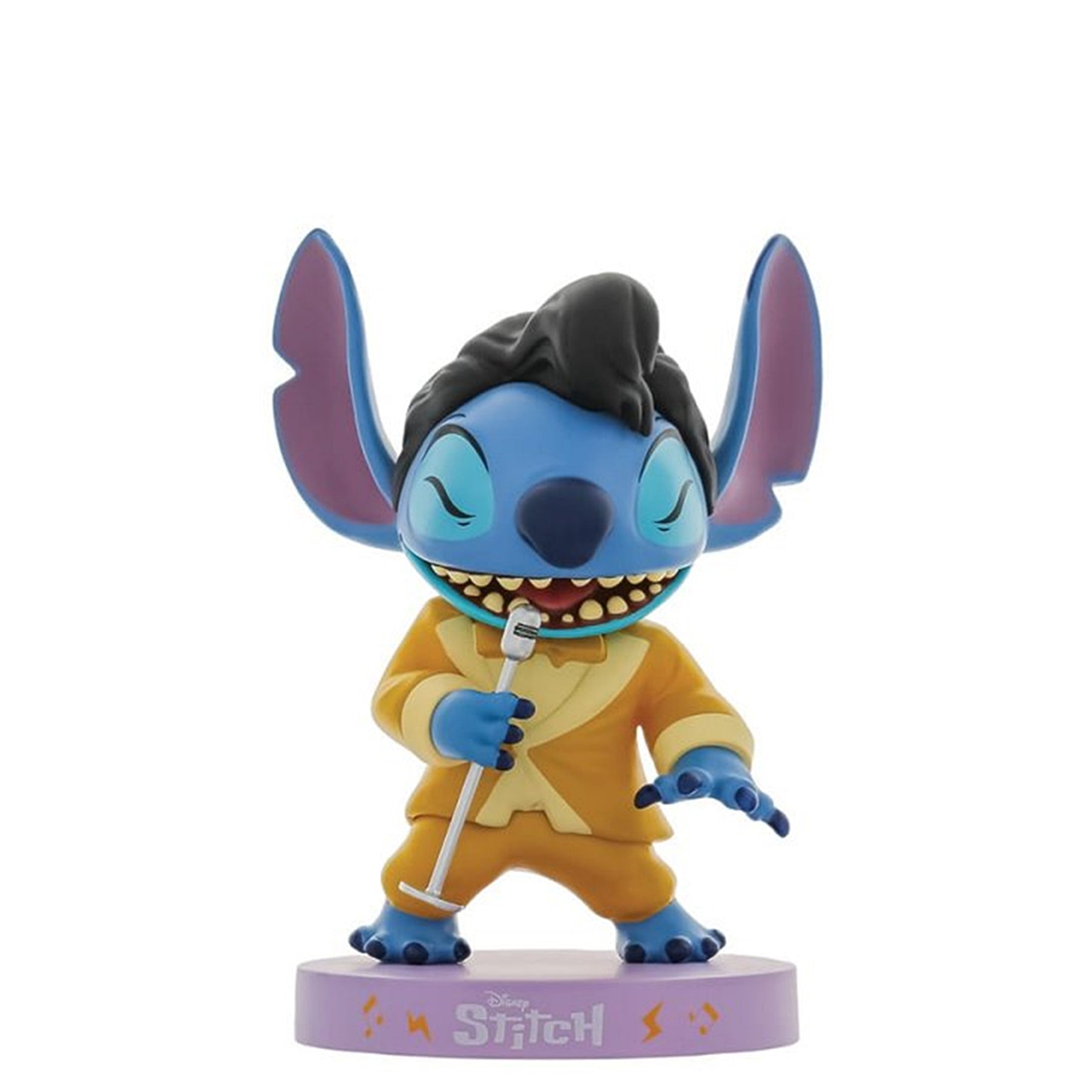 Inspiriert von Elvis Presleys ikonischem goldenen Lame-Anzug präsentiert Grand Jester Studios diesen Stitch aus Vinyl, der im goldenen Smoking in ein metallisches Mikrofon singt.