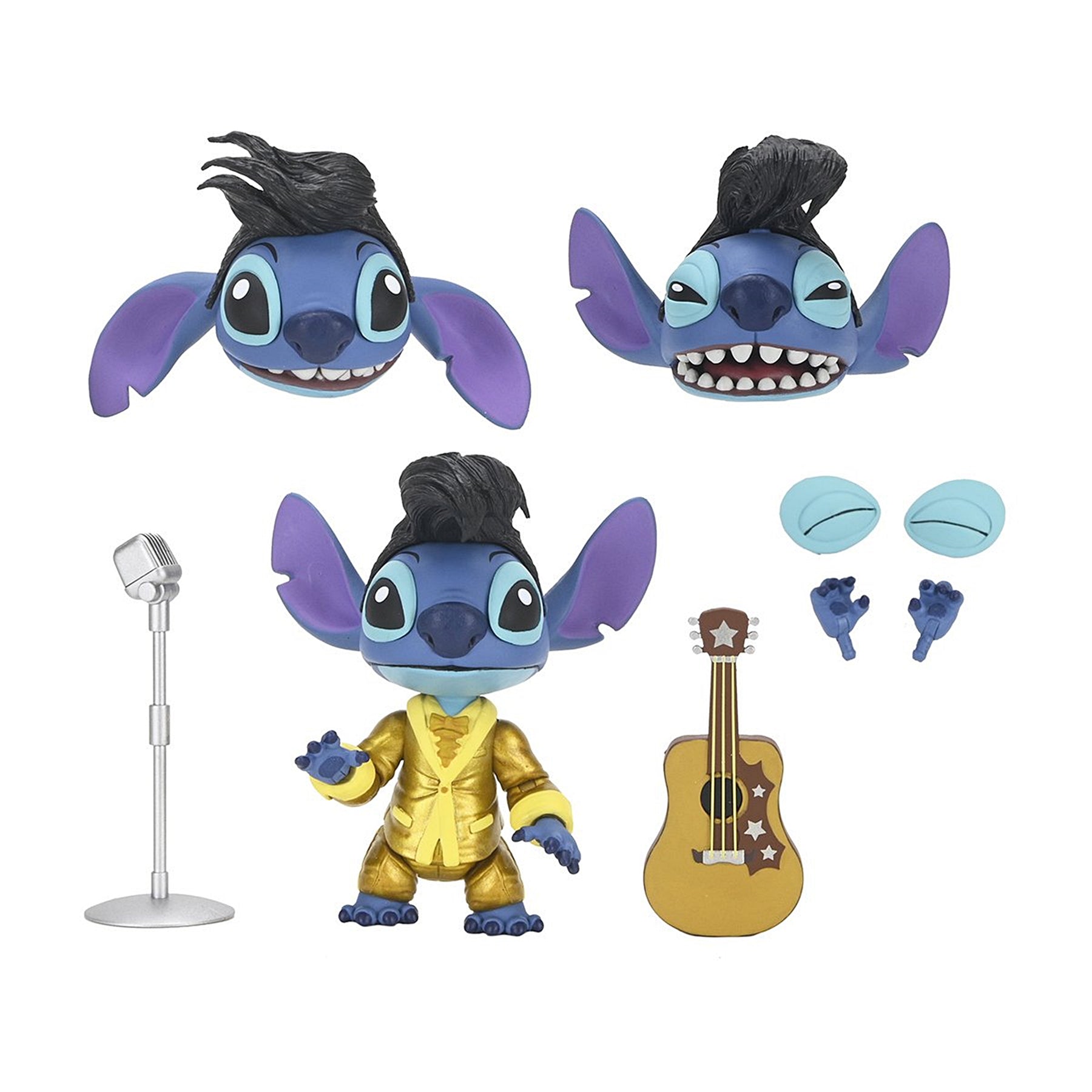 Der voll bewegliche Stitch trägt eines von Elvis‘ kultigsten Outfits, ist über 7,5 cm groß und bereit, die Bühne mit seinen größten Hits zu rocken! Als Zubehör sind austauschbare Köpfe, Hände, Haarteile, Augenplatten sowie ein Gitarren- und Mikrofonständer enthalten. Alles wird in einer sammlerfreundlichen Verpackung geliefert, die sich perfekt zum Ausstellen eignet.